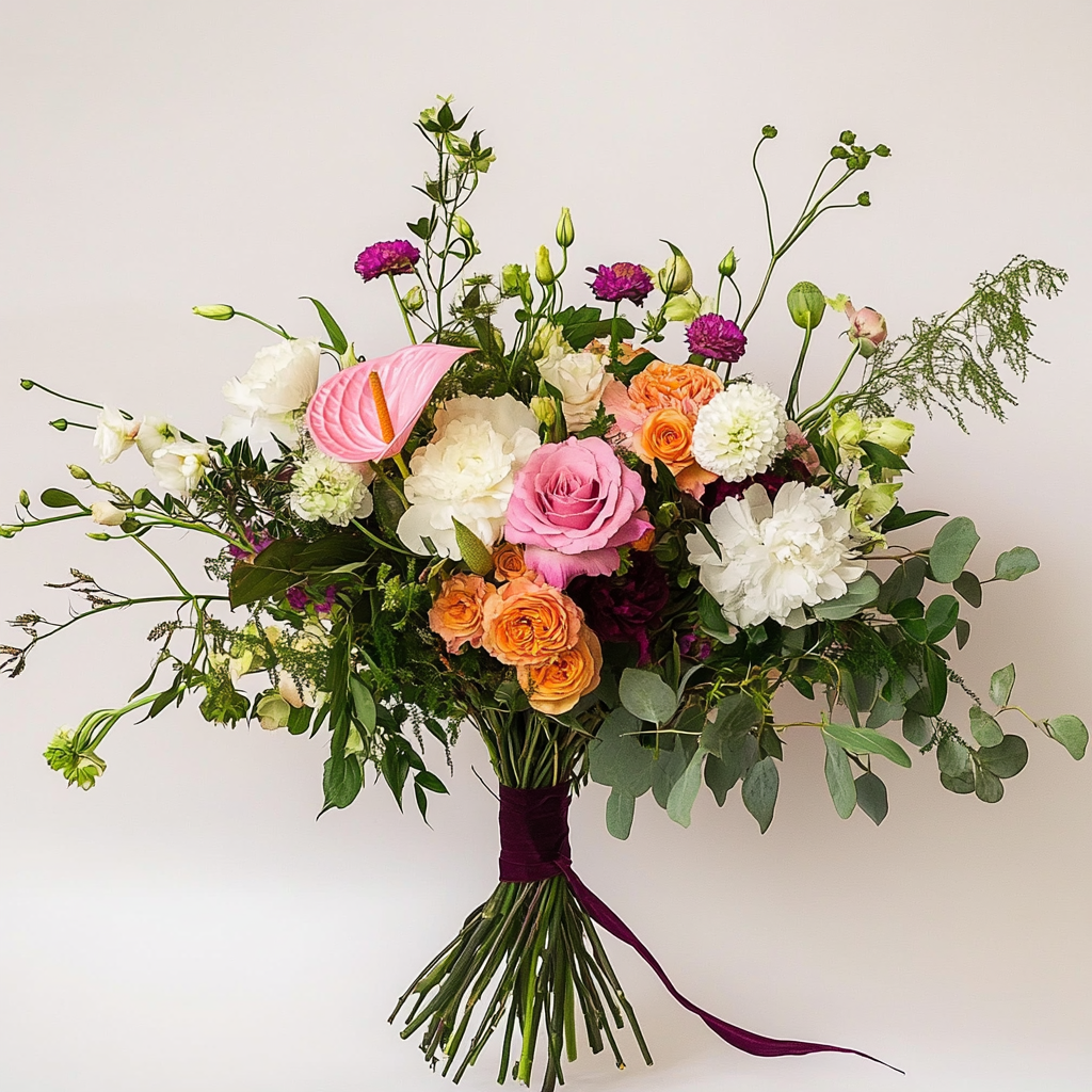 Oh man, this bouquet’s like a sunset in your hands—vibrant pinks from that showstopper anthurium mixing with creamy whites, soft peonies, and pops of orange roses. Throw in some purple accents and lush eucalyptus for that wild, fresh vibe. It’s perfect for surprising your bestie on a tough day or adding romance to date night… you know, that ‘wow, you get me’ moment that lights up their face.